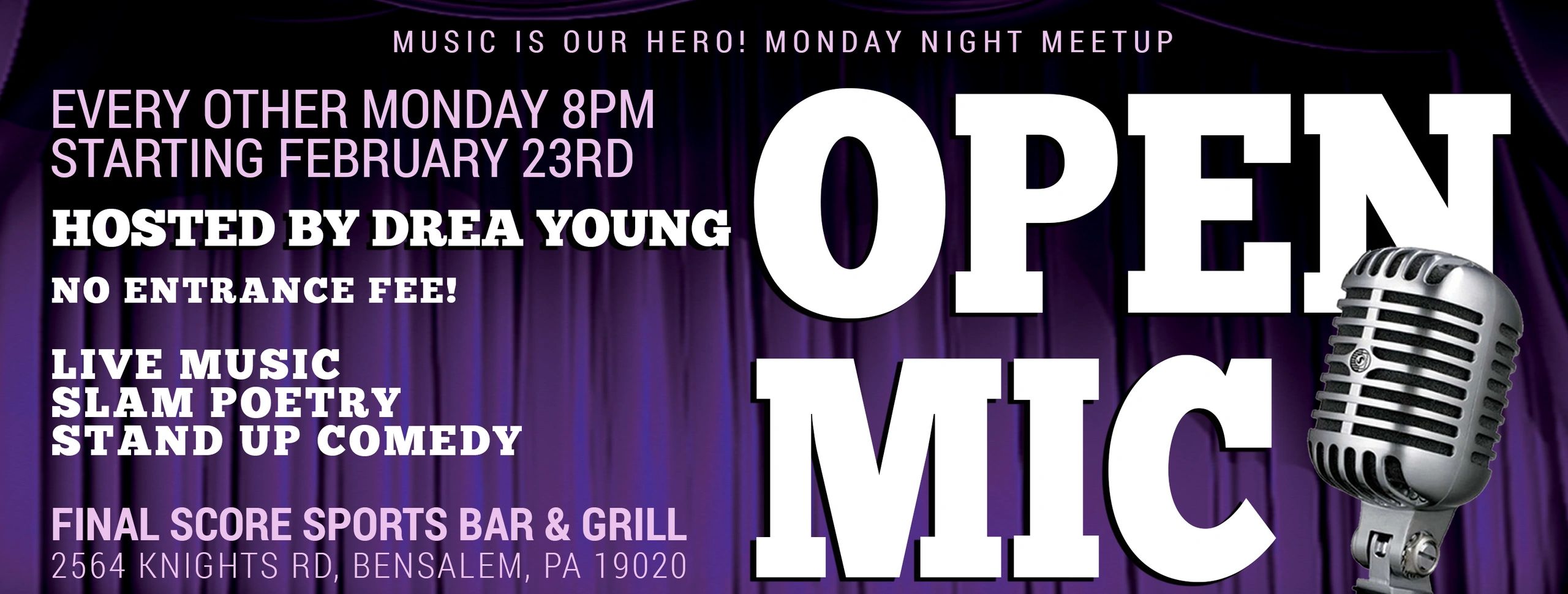 This Meetup is built differently. It's casual. Every other Monday starting February 23rd, artists and music lovers are invited to a welcoming, well-run open mic where Grammy winner, Drea Young, handles it all! Hosting the stage, running sound, and bartending the night. The result is a smooth experience with great sound, great flow, and great vibes.